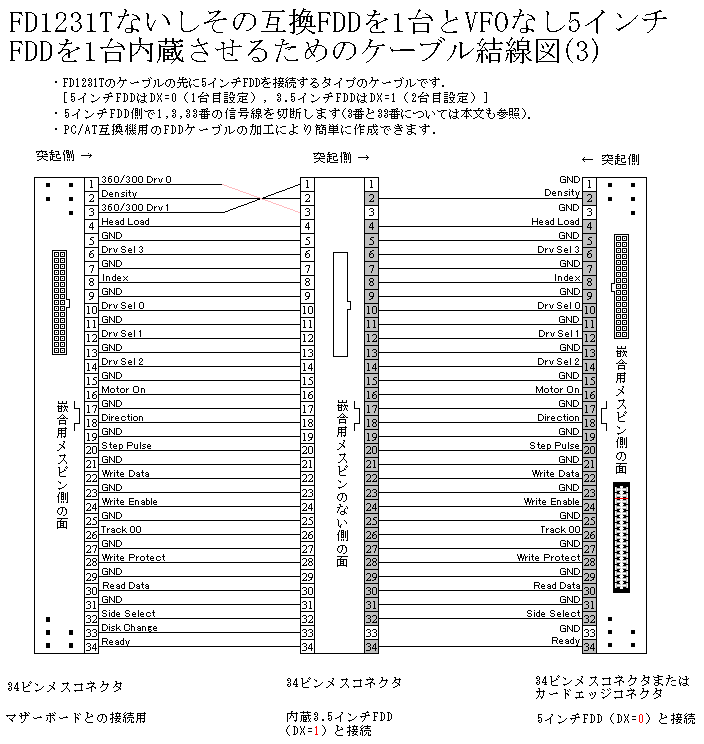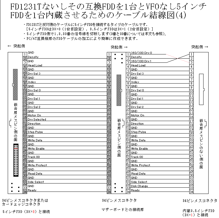 5インチFDD内部増設用ケーブルの各ケーブル結線図に信号名を追加したものです.各ケーブルの説明や注意事項がありますので,5インチFDD内部増設用ケーブルの記事を併読して下さい. ■FD1231T内蔵機種にVFOあり5インチFDDを1台内部増設するケーブル(PC-9821-K08相当ケーブル) ■FD1231T内蔵機種にFD1231T 1台とVFOあり5インチFDD 1台を内蔵させるケーブル(1)・(2) ■FD1231T内蔵機種にFD1231T 2台とVFOあり5インチFDD 1台を内蔵させるケーブル(1)・(2) 注:VFOあり5インチFDDがFD1155D/FD1157Dの場合,ターミネータの合成抵抗値(248Ω)の関係で,青札タワー機では使用できないことを確認しました(同じタワー型でも,V16などでは使用できます).青札タワー機(を含む最後期型機種?)用には,下の "FD1231T内蔵機種にFD1231T 2台とVFOあり5インチFDD 1台を内蔵させるケーブル(青札タワー機用)" を作成して下さい. ■FD1231T内蔵機種にFD1231T 2台とVFOあり5インチFDD(FD1155D/FD1157D)1台を内蔵させるケーブル(青札タワー機用)(1)・(2) ■FD1231T内蔵機種にFD1231T 1台とVFOあり5インチFDD 2台を内蔵させるケーブル(1)・(2) 注:VFOあり5インチFDDがFD1155D/FD1157Dの場合,ターミネータの合成抵抗値(152Ω)の関係で,青札タワー機では使用できないと思われます.但し筆者は青札タワー機を所有していないため確認できません.青札タワー機(を含む最後期型機種?)用には,下の "FD1231T内蔵機種にFD1231T 1台とVFOあり5インチFDD 2台を内蔵させるケーブル(青札タワー機用)" を作成してみて下さい. ■FD1231T内蔵機種にFD1231T 1台とVFOあり5インチFDD 2台を内蔵させるケーブル(青札タワー機用)(1)・(2) (3.5インチFDD = 1台目,5インチFDD = 2・3台目) ■FD1231T内蔵機種にFD1231T 2台とVFOあり5インチFDD 2台を内蔵させるケーブル 注:VFOあり5インチFDDがFD1155D/FD1157Dの場合,ターミネータの合成抵抗値(142Ω)の関係で,このままでは青札タワー機では使用できないと思われます.但し筆者は青札タワー機を所有していないため確認できません.青札タワー機(を含む最後期型機種?)用には,下の "FD1231T内蔵機種にFD1231T 2台とVFOあり5インチFDD 2台を内蔵させるケーブル(青札タワー機用)" を作成してみて下さい. ■FD1231T内蔵機種にFD1231T 2台とVFOあり5インチFDD 2台を内蔵させるケーブル(青札タワー機用) ■FD1231T内蔵機種にFD1231T 1台とVFOなし5インチFDD 1台を内蔵させるケーブルA(3.5インチFDD = 1台目,5インチFDD = 2台目)(1)・(2) ※FD1231TのDXを0に,VFOなし5インチFDDのDXを1にそれぞれ設定. ■FD1231T内蔵機種にVFD1231T 1台とVFOなし5インチFDD 1台を内蔵させるケーブルB(5インチFDD = 1台目,3.5インチFDD = 2台目)(3)・(4) ※FD1231TのDXを1に,VFOなし5インチFDDのDXを0にそれぞれ設定. ■FD1231T内蔵機種にVFOなし5インチFDDのみを2台内蔵させるケーブル 注1:VFOを無効にしたFD1155D/FD1157Dを2台内蔵させる場合には,下の "FD1231T内蔵機種にVFOを無効にしたFD1155Dのみを2台内蔵させるケーブル" を作成して下さい.また5インチFDDが3モードFDDと誤認識されますが(フォーマットの際に1.44MBメディアが誤って選択できてしまうこと以外は使用上問題ありません),旧版のケーブルも使用できます(このケーブルはVFOを無効にしたFD1155Dのみを2台内蔵させるケーブルと兼用にできます). 注2:ターミネータの合成抵抗値(多くは恐らく150Ω程度)の関係で,青札タワー機(を含む最後期型機種?)では1台目の(ケーブルの端側でない)5インチFDDのターミネータを無効にする必要があると思われます(筆者は当該機種を持っておらず確認できません). ■FD1231T内蔵機種にVFOを無効にしたFD1155D/FD1157Dのみを2台内蔵させるケーブル 注:ターミネータの合成抵抗値(165Ω)の関係で,青札タワー機で使用するためには,1台目の(ケーブルの端側でない)FD1155Dのターミネータを無効する必要があるかもしれませんが,筆者は青札タワー機を所有していないため確認できません. ■FD1231T内蔵機種にFD1231T 1台とVFOなし5インチFDD・VFOあり5インチFDD 各1台を内蔵させるケーブル(1)・(2) 注:VFOなし5インチFDDがFD1155CでVFOあり5インチFDDがFD1155D/FD1157Dの場合,ターミネータの合成抵抗値(142Ω)の関係で,このままでは青札タワー機では使用できないと思われます.但し筆者は青札タワー機を所有していないため確認できません.青札タワー機(を含む最後期型機種?)用には,下の "FD1231T内蔵機種にFD1231T 1台とVFOなし5インチFDD・VFOあり5インチFDD 各1台を内蔵させるケーブル(青札タワー機用)" を作成してみて下さい. ■FD1231T内蔵機種にFD1231T 1台とVFOなし5インチFDD・VFOあり5インチFDD 各1台を内蔵させるケーブル(青札タワー機用)(1)・(2) (3.5インチFDD = 1台目,VFOなし5インチFDD = 2台目,VFOあり5インチFDD = 3台目) ■FD1138Tを1台内蔵した機種(MATE-AはファイルベイモデルのPC-9821Ap3/As3のみを含む)にVFOなし5インチFDDを1台内部増設するケーブルA(3.5インチFDD = 1台目,5インチFDD = 2台目)(1)・(2) ※VFOなし5インチFDDのDXを1に設定. ■FD1138Tを1台内蔵した機種(MATE-AはファイルベイモデルのPC-9821Ap3/As3のみを含む)にVFOなし5インチFDDを1台内部増設するケーブルB(5インチFDD = 1台目,3.5インチFDD = 2台目) ※VFOなし5インチFDDのDXを0に設定. ※※※この