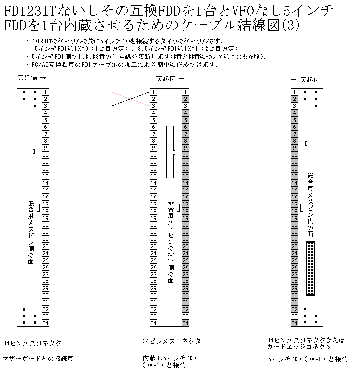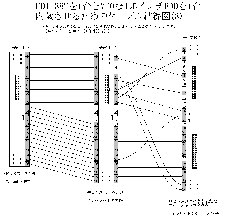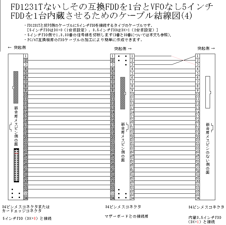 3.5インチFDD[FD1138T/26ピンFD1148T, FD1231T/MPF520-F/OSD/OSD-u(E26J)/34ピンFD1148T]を1台または2台,および5インチFDD(FD1158C)を1台内蔵したPC-98に5インチFDDを内部増設するためのケーブルの結線図です.コネクタ間の長さは機種に合わFて決めて下さい.以後本記事では,FD1138Tと26ピンFD1148TをまとめてFD1138Tと,また FD1231T,MPF520-F,OSD,OSD-u(E26J),34ピンFD1148TをまとめてFD1231Tと表記します. 結線図にはコネクタ各ピンの信号名を記載していません(信号名を含む結線図も用意してあります.コネクタのピンアサインと信号名については,HAMLIN's PAGE --> FDD関係 の他,FD1231TとVFOなし5インチFDDの信号の異同,FD1138T 2台内蔵用ケーブル,FD1138TをFD1231TまたはVFOなし5インチFDDで代替,30ピン-34ピン変換ケーブル(ファイルベイアダプタ付属ケーブル同等品),VFOなし異種FDD内蔵用ケーブル 等の記事も参照して下さい).またFDDのターミネーションに関してはFDDの信号レベルとターミネータの値を参照して下さい. ピンが描かれているコネクタは嵌合面,描かれていないコネクタは配線面がそれぞれ示されています.また図中の_| ̄|_は,メスコネクタでは切り欠きの方向を,またオスコネクタでは突起の方向をそれぞれ示します. 5インチFDDのコネクタは,FD1158D等に接続するための34ピンフラットケーブル接続用メスコネクタで図示していますが(コネクタの種類とピン番号 の "34ピンコネクタ①"),これをFD1155Dなどの34ピンカードエッジメスコネクタとすることもできます(コネクタのピン番号と信号の関係は両者で共通. コネクタの種類とピン番号 の記事を参照)(注1・2・3).なお "FD1158Cを1台内蔵した機種にVFOなし5インチFDDを内部増設するケーブル" を除き,下に示す各ケーブルは,入手が最も容易と思われるFD1155D(VFOを無効にしたものも含む)を含むいくつかの5インチFDDで動作することを確認してあります. 注1:FD1155Dのジャンパスイッチの設定方法については エマティなリサイクル --> 研究発表会 --> 98FDDドライブ設定表 などを参照して下さい. 注2:FD1155C/Dで,特に天板がなくヘッド部分が剥き出しの構造をしている初期型のものは,PC本体に内蔵した場合に電源ユニット由来のノイズによって読み書きに障害が出る場合があるようです.この問題の対策については,VFOありFDDの外付け化を参照して下さい. 注3:34ピンカードエッジメスコネクタには,3・4ピンと5・6ピンの間に切り込みがあります.通常34ピンカードエッジオスコネクタには,嵌合方向を誤らせないために,3・4ピンと5・6ピンの間にこの切り込みにはまる板状の仕切がありますが,中にはこれがないものもあります.このようなコネクタでも,ハウジングに1ピンの位置のマーキングを行うなどすれば誤嵌合を減らせるでしょう.またプラスチック板などで作った仕切をコネクタに填め込むこともできます.下のコネクタの仕切(白い部分)はヨーグルトの容器の蓋から切り出したものです. |
